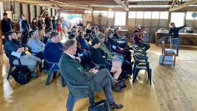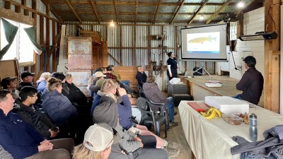The last stop of the day was Ben Morven Farm, Marlborough DFA Branch Chair Geoff Hayes’ farm just outside of Blenheim. As a bit of a running theme, the previous night’s rain meant the field demonstration by Marlborough District Council freshwater scientist India Hamill could not be done in any of the farm’s waterways and so shifted inside the woolshed for a more theory-based presentation.