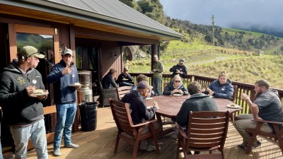 A leisurely morning tea with chats over cheese rolls and scones, provided by Justin Stevens and family, meant we were behind time getting out onto the farm, but recent rains meant more time was spent in Jason’s deer shed anyway, where remarks on recent work to the interior were common, and one attendee was said to remark, “First time I’ve heard a deer shed called beautiful before.”