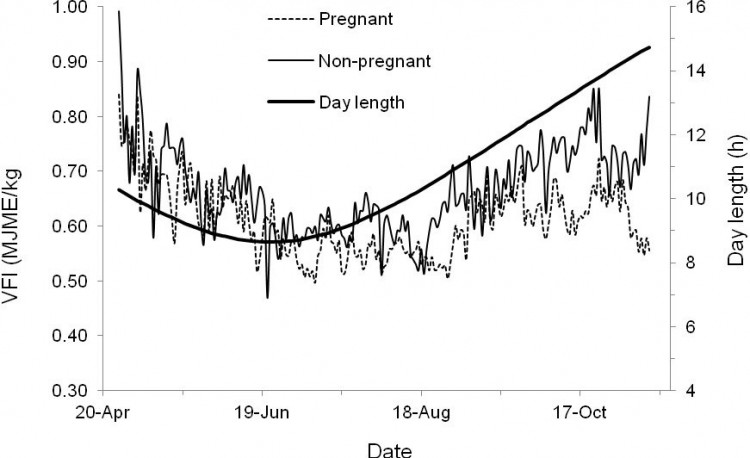 Figure 3: Predicted mean daily voluntary food intake of pregnant and non-pregnant hinds relative to day length (hours between sunrise and sunset) during indoor feeding.(Scott, I.C., Asher, G. W., Barrell, G.K., Juan, J.V. (2012).