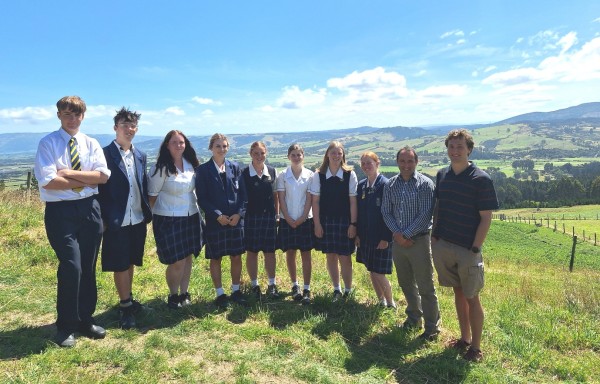Bryan Thompson and Archie White (right) with hopefully the next generation of deer farmers (from Taieri College) Photo: Lynda Gray