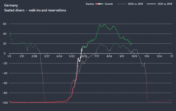 Data from Opentable shows that German consumers were out supporting restaurants over the summer, with patronage 60% higher than in 2019 at the height of summer. It is currently sitting at around 20% above 2019 levels. The European hospitality scene has been well supported over the last two years which has enabled most restaurants to remain open. The hope is that with high vaccination rates in Europe and the requirement to have a vaccine passport to dine in restaurants, customers will continue to eat out over the next few months.